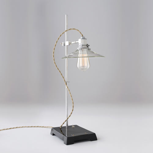 From top to bottom, we see two views of the Ion table lamp, the first with a khaki twisted fabric cord and the second with a red twisted fabric cord. Next is the charming Beaker Lab light, followed by the Lift, Task Lab, and Orb table lamps. Visit their website to see more!
