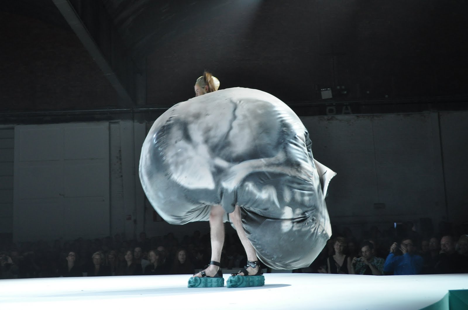 The Royal Academy of Fine Arts' Fashion Department has created some amazingly talented designers who don't create clothing or fashion, but who create costume and art. Kündig's wildly imaginative and humorous collection featured fake buck teeth and shoes that looked like cracker boxes decorated with skulls, nearly impossible to walk in. Of course the show stopper was the inflatable skull worn as an overcoat! Hilarious!