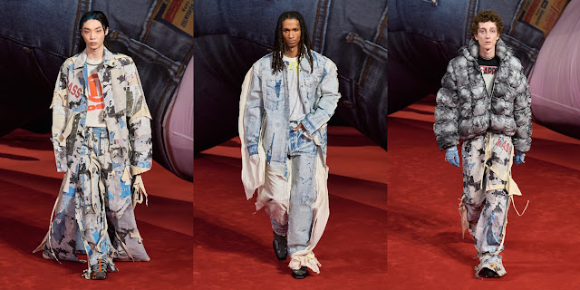 While clothing brand Diesel might be known as a "denim" brand, newly-crowned Creative Director Glenn Martens (who is still heading up Y/Project previously here, where he twists and folds excess fabric into voluminous slouchy puffy silhouettes) decided to take the humble and ubiquitous material beyond its traditional bounds. What results are some pretty amazing creations. This Fall-Winter '22-'23 collection at Milan Fashion Week starts off innocently enough with some ripped jeans on a model in a beautiful sheer top, but quickly morphs into denim bonded with neoprene for a cool, glossy look. From there, the rest of the collection is an exploration of experimental pieces crossed with the sense of classic denim: avant garde and street-wise at the same time. The most amazing pieces in this collection are the "fur" coats: no actual fur, just the cut, frayed, and fluffed edges of denim. Awesome. Also of note are the pretty cool cross-body bags imprinted with the Diesel logo "D" that look like gas tanks from a motorcycle (in black in Look #5 and in silver in Look #9).