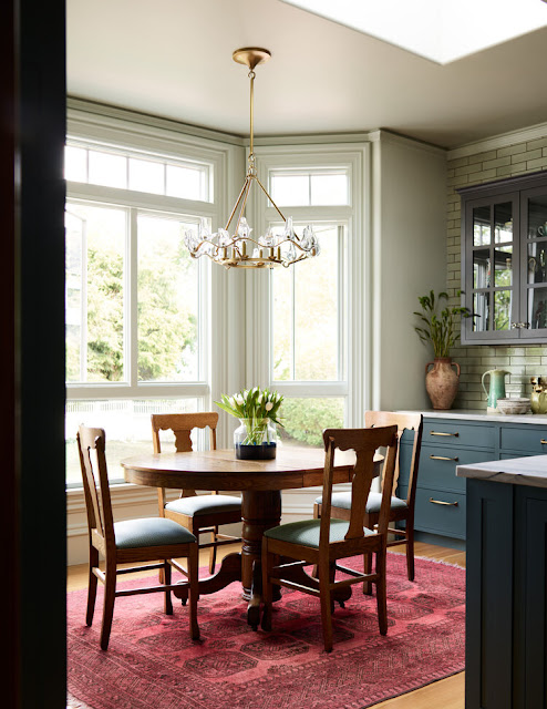 Interior designer Cecelia Casagrande is clearly a maximalist, a designer after my own heart. I love her choices for this Colonial Revival home built in 1895 by developer Moses Crane in Newton, Massachusetts. The dark colors on the ground floor are marvelous, moody, and certainly reminiscent of a Victorian sensibility. Animal motifs abound with art works by Hunt Slonem, the Leopard Walk wallcovering by Cole & Son in the dining room, and the truly delightful Ms. Ward wallpaper by Grow House Grow in a powder room which features a small repeating print of scientist Mary Ward walking an enormous praying mantis. Casagrande's color palette and fearless pattern mixing add to the rich, layered sense of this house--the styling throughout is fantastic. And surprising is her use of the palest pink in the primary suite, which really does look incredible with the Carrera marble in the bathroom.